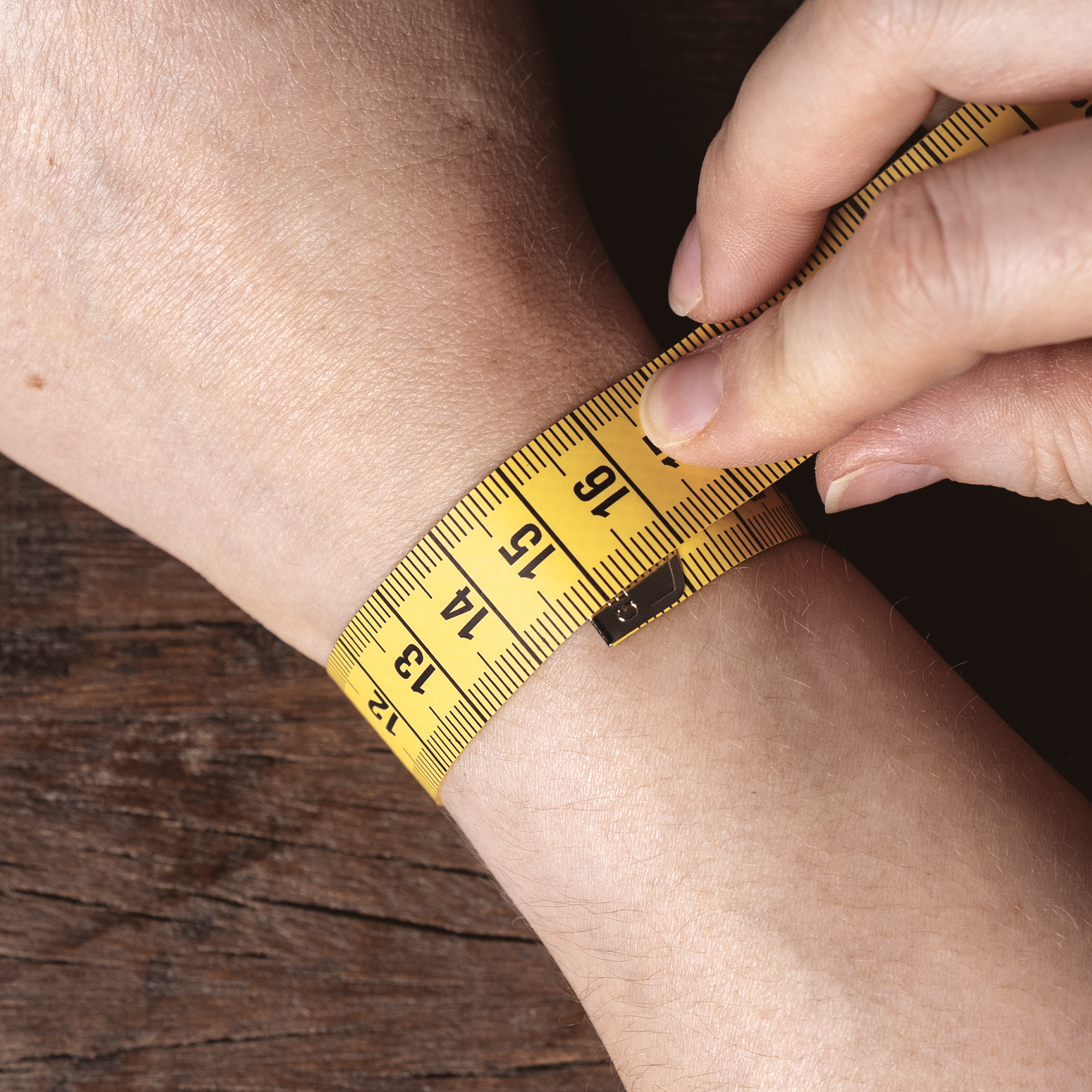 - Nimm dir ein Massband und lege es an der schmalsten Stelle eng um dein Handgelenk. Das Massband darf nicht locker an deinem Handgelenk anliegen, aber auch nicht so satt, dass es einschneidet.
